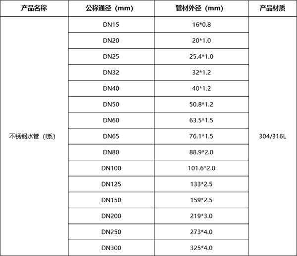| 不锈钢水管(I系) | DN15 | 16 × 0.8 | 304 / 316L |