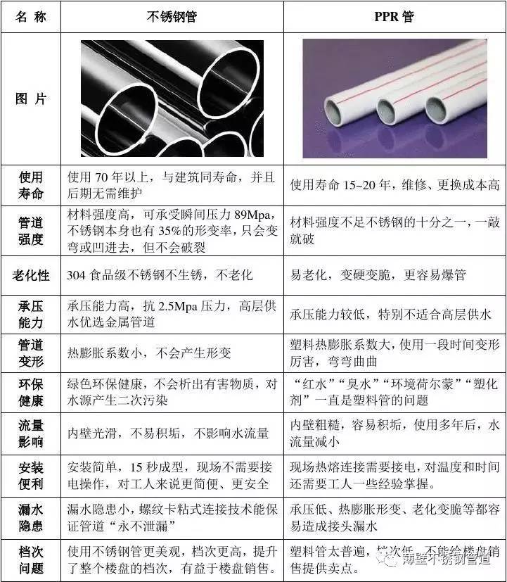 自人类在20世纪发明不锈钢以来,不锈钢目前已是普通材料了。目前在各种材质水管的性能价格比中,最优是 薄壁不锈钢水管。这与不锈钢材料的耐腐蚀、高强度,抗冲力强等的优越性能有关。其使用寿命可以说与建筑物同寿命。一次投入,终生受益,可谓是“一劳永逸”。