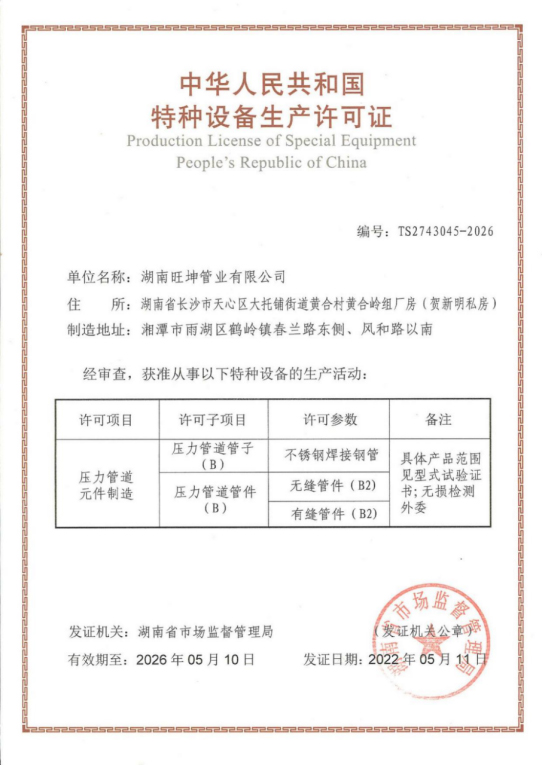 1、生产许可:持有《特种设备生产许可证》,具备高压、高要求环境下的管道生产资格。