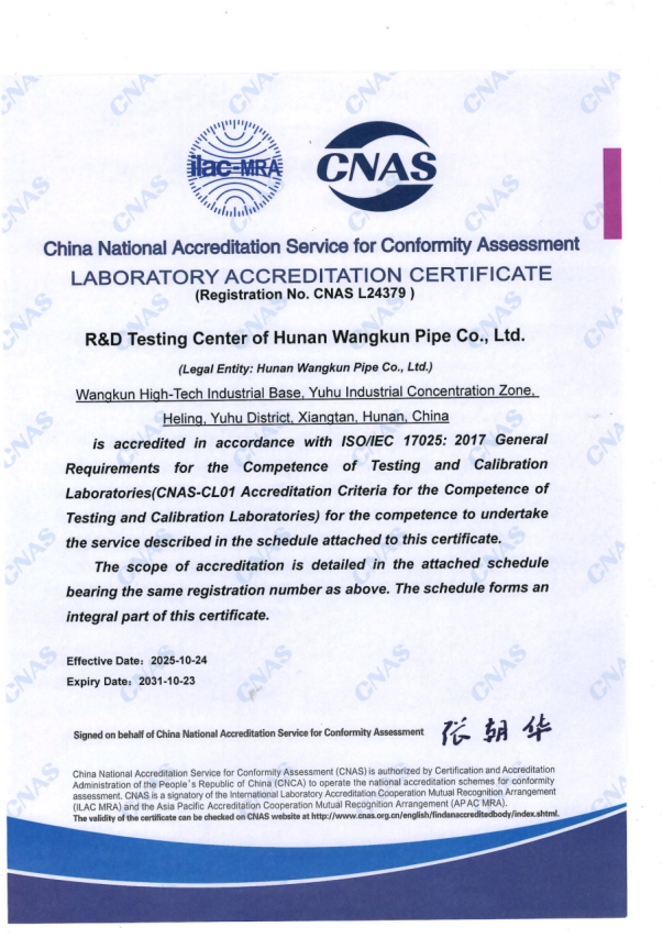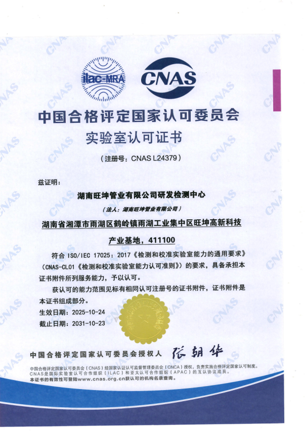2025年10月24日,湖南旺坤管业有限公司迎来里程碑式突破——公司研发检测中心正式通过中国合格评定国家认可委员会(CNAS)的严格评审,荣获“国家CNAS实验室认可证书”。这标志着旺坤管业的检测能力、管理体系与结果公信力均已达到国际先进水平,为其高质量发展注入强劲动能。