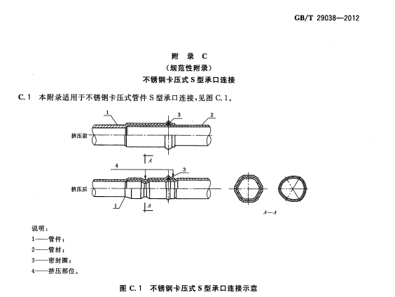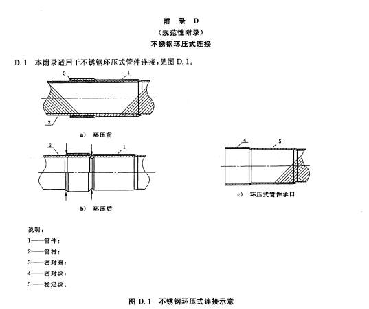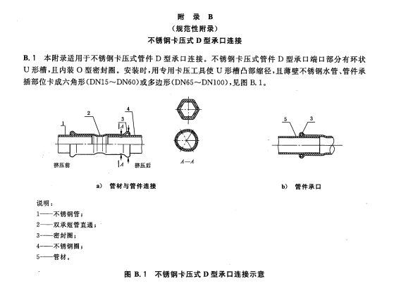 3.3 卡压式连接(press jointing):以带有特种密封圈的承口管件连接管道,用专用工具钳压承口部位后断面呈六角型或多边型压缩紧固密封的一种连接方式。根据端部卡压连接方式分为 D 型承口连接和 S 型承口连接。