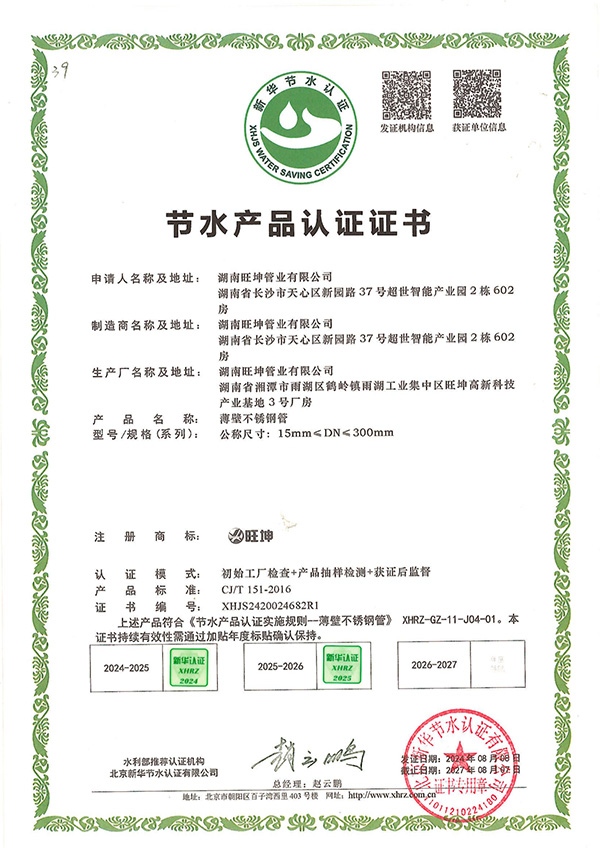 2025年,湖南旺坤管业有限公司凭借其卓越的产品品质与可靠的节水性能,再次获得权威机构颁发的2025-2026年度节水产品认证证书。这已是该公司连续第三年获此殊荣,彰显了其在不锈钢水管领域持之以恒的技术追求与对水资源保护的社会责任担当。