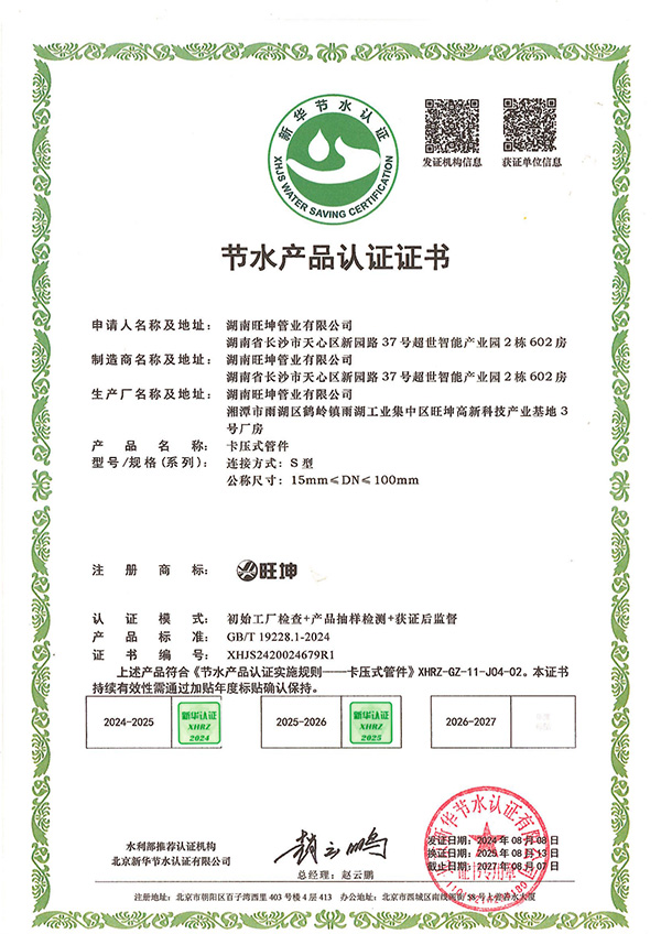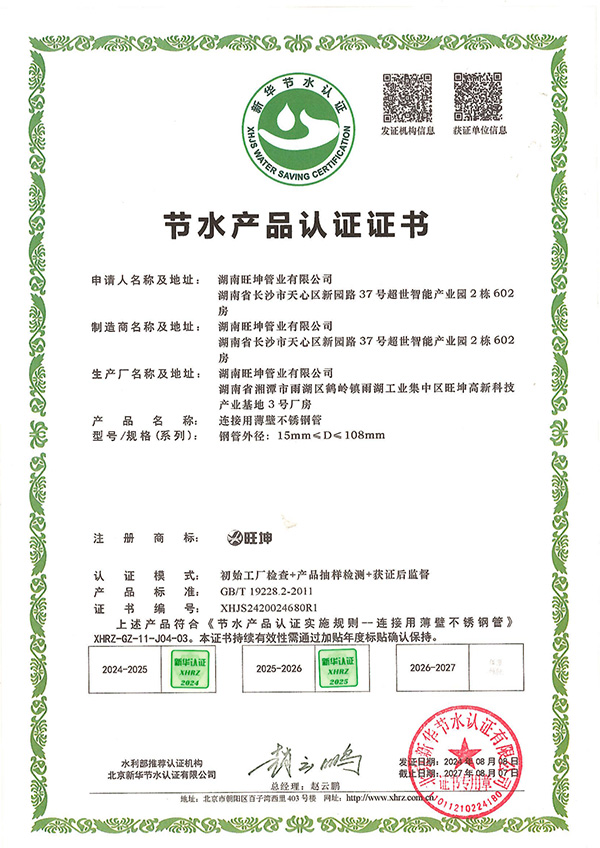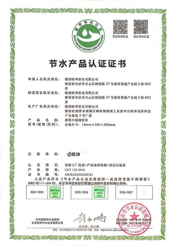 节水认证是由国家水利部推荐、经权威认证机构严格审核后颁发的权威资质。此次认证由北京新华节水认证有限公司执行,对湖南旺坤管业生产的薄壁不锈钢管、连接用薄壁不锈钢管、卡压式管件及薄壁不锈钢管件(公称尺寸15mm至300mm全系列)进行了全面评估。认证模式涵盖了严格的初始工厂检查、产品抽样检测及获证后监督,确保产品完全符合 CJ/T 151-2016 行业标准及《节水产品认证实施规则》的要求。
