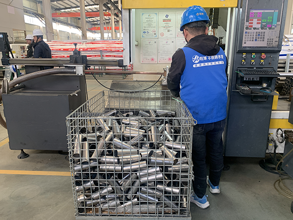 (图为湖南旺坤管业生产基地,专业工人在进行卫生级不锈钢管的卡压接头安装作业。这种连接方式能确保管道系统的长期密封与卫生安全。)